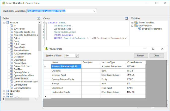 Devart SSIS Data Flow Components for QuickBooks allow you to integrate QuickBooks Customers, Transactions, Invoices, Sales Receipts, and other objects with other cloud applications and databases via SQL Server Integration Services (SSIS). They include optimized QuickBooks Source, QuickBooks Destination, and QuickBooks Lookup components and provide their own QuickBooks Connection Manager.