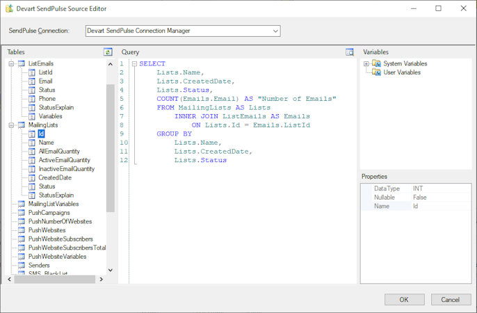 The SendPulse Source supports SQL querying, translating simple statements directly to SendPulse API calls and processing more complex queries locally. The convenient editor provides a drag-and-drop interface for building queries, displaying all SendPulse objects and fields, and allowing users to quickly add system and user variables. Advanced optimization techniques, such as caching and batch processing, ensure high performance for the SendPulse Lookup and Destination components.