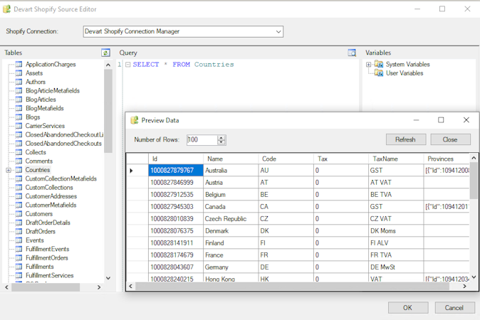 With these components, users can quickly build SSIS-based integration solutions for Shopify, automating the integration process through SSIS Data Flow tasks. The components support importing and exporting CSV files to Shopify, and enable synchronization between Shopify and SQL Server or other data sources. The Devart Shopify Source component offers advanced SQL support, translating simple statements directly to Shopify API calls and processing more complex queries locally. The convenient Devart Shopify Source editor provides a user-friendly interface for building queries, displaying Shopify objects and fields, and previewing data.