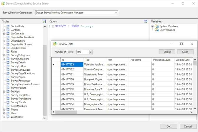 With these components, users can quickly build SSIS-based integration solutions for SurveyMonkey, automating the process of importing and exporting data, including CSV files, and synchronizing SurveyMonkey with SQL Server or other data sources. The SurveyMonkey Source supports SQL, allowing users to execute complex SELECT statements with grouping, filtering, and ordering directly on the SurveyMonkey side, while the advanced lookup optimizations of the SurveyMonkey Lookup component ensure high performance by caching results and reducing server round-trips.