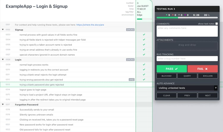 Testpad eliminates common frustrations associated with traditional test management tools by avoiding rigid structures, complex tutorials, and lengthy report generation times. Users can start testing within minutes, tag and filter tests to focus on specific subsets, invite guest testers without requiring logins, and edit tests during the testing process when new insights emerge. The system also facilitates collaboration through shared progress reports and seamless handover between devices, including mobile testing capabilities.