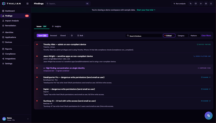 Thalian is an AI powered IT stack intelligence platform that connects disparate enterprise technology systems to identify security risks, operational waste, and compliance gaps that remain invisible when tools operate in isolation. The software is designed for IT security teams, system administrators, and compliance officers in organizations managing complex technology stacks across identity management, endpoint security, and software as a service application portfolios. By establishing connections across identity providers, mobile device management systems, endpoint detection and response tools, and business applications, Thalian performs cross-platform data analysis to surface findings that require information from multiple sources. The platform delivers actionable intelligence about access risks, license inefficiencies, shadow IT proliferation, and security posture degradation.