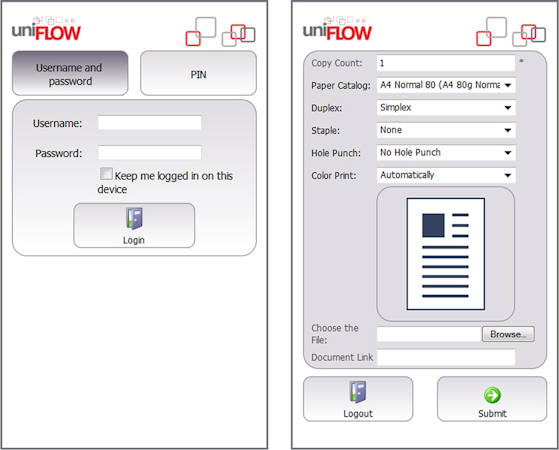 With uniFLOW, users can securely print sensitive documents through a shared network printer submitted through their desktop or mobile device. Users release print jobs at the printer after authentication via card login, job code or PIN code, ensuring that confidential documents are not left sitting on the printer. Printing, scanning, copying and faxing costs can be tracked and allocated to the relevant project or department, and budget controls enable automatic limiting of printing once budgets have been exceeded. Jobs can also be routed to the cheapest or most appropriate printer, and users can be forced to print jobs in duplex or grayscale.
