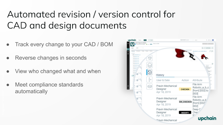 The platform enables managers to track the time and reason for changes across documents and restore previous versions on a unified interface. Upchain PDM allows teams to integrate the solution with enterprise resource planning (ERP) systems and manage engineering change requests (ECR). Operators can also view files related to different projects, assemblies, and product development processes on a unified interface.