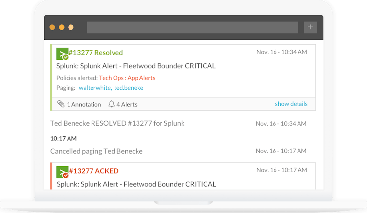 With Splunk On-Call (formerly VictorOps), on-call isn't a four-letter word. Our incident management software aligns log management, monitoring, chat tools, and more, for a single-pane-of-glass into system health. Using this IT and DevOps system data, we support automated alerting, centralized information, and essential documentation. Teams receive context-rich notifications and collaborate cross-functionally to empower fast, efficient incident resolution, and reduced downtime.