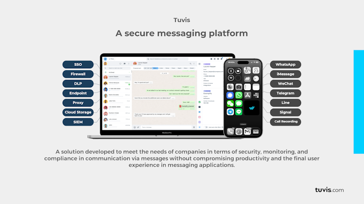 Tuvis is a unified security and compliance platform that helps organizations monitor, archive, and protect communications across leading messaging channels such as WhatsApp, Telegram, and Microsoft Teams. Designed for regulated industries, Tuvis automatically captures all messages, media, and documents in real time, ensuring compliance with internal policies and external regulations. The platform includes advanced search and retrieval tools, granular access controls, and secure authentication via Single Sign-On (SSO). Tuvis also offers Data Loss Prevention (DLP), channels controls, and encryption to prevent leaks and security breaches. Beyond compliance, Tuvis enhances productivity by integrating directly with CRM systems like Salesforce and Microsoft Dynamics 365, enabling users to view customer data, create records, and manage interactions seamlessly within their messaging apps — all in a secure and compliant environment.