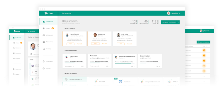 Youzer provides IT, HR, and managers with centralized access to all IT system users. A comprehensive user list allows them to know in real time who has access to which resources, and directly modify the access rights of a particular user. Organizations can also see the number of users allocated to each software, and compare the resources assigned to users with the same role in order to adapt the accounts of each user. Features for employee offboarding ensure that access isn't left open to employees who have left the company through pre-programmed, automatic suspension of resources on departure dates.