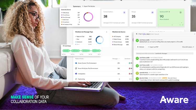 The Aware platform provides a consolidated, contextual, 360-degree view of an organizations collaboration data. It provides controls for efficiency, risk management, privacy, and compliance. Aware enables users to access, manage, and collect data across all collaboration tools, normalized into a single unified dataset. The centralized database streamlines efficiency, data privacy, information governance, and retention to produce real business impact.
