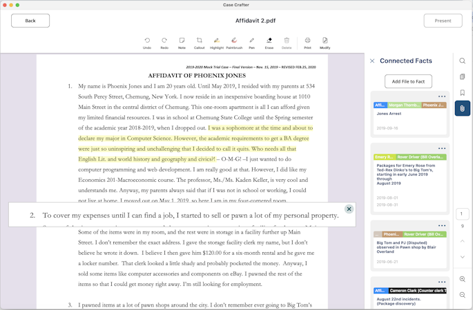 Convince the jury and secure your victory with Case Crafter! Now you can seamlessly review case files, create visual timelines, and present compelling arguments—all within our single, user-friendly legal presentation software. Strengthen your case by identifying crucial details as you analyze documents. Gain a comprehensive perspective through our interactive timeline software for lawyers that consolidates all key facts for a clear, complete view of the case.