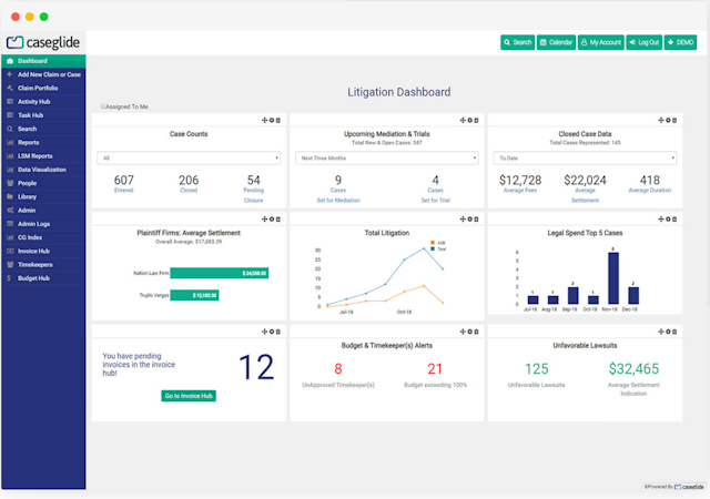With CaseGlide’s litigation management system, claims leaders can now better predict and manage case outcomes, reduce cycle time through greater visibility into every activity on a file, improve case outcomes by assigning the right attorney on the right case, avoid surprises by spotting problem cases and cases which are off track, drive specific workflows or actions based on specific case developments, and work files more strategically.