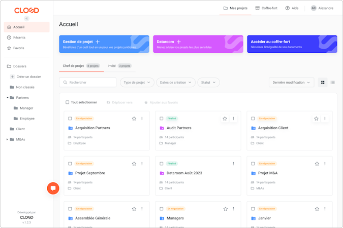 Closd is a global collaborative solution that includes both a legal transaction management platform and a next-generation data room. Designed by former lawyers, the solution allows users to manage complex legal transactions and deals via a unified portal. The solution allows lawyers, legal departments, accountants, and investment banks to simplify exchanges with their clients and partner, secure exchanges and sensitive documents, and automate time-consuming tasks.