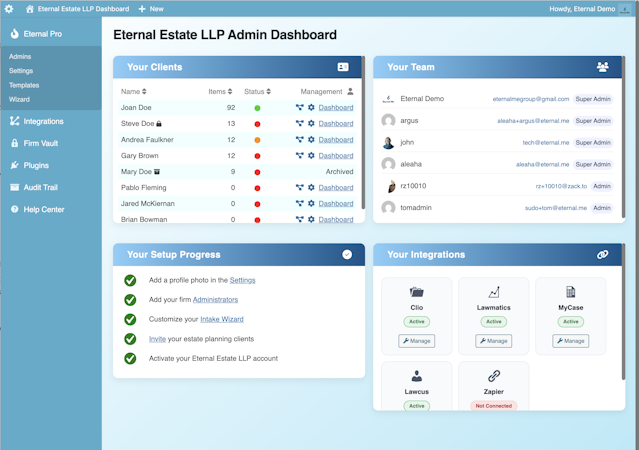 Eternal Pro is an intake platform for estate attorneys that automates the collection of client information and asset documentation for estate planning purposes. The system supports both conventional asset records and digital asset inventories within a centralized environment. It addresses the evolving requirements of legal professionals preparing for increasingly digital estates and anticipated regulatory changes by the year two thousand twenty six.