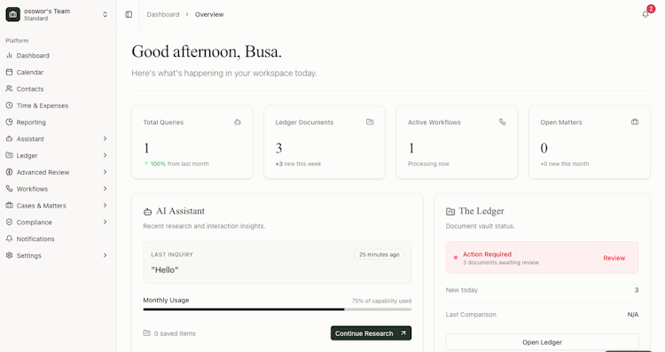 • Unified Practice Workspace: Consolidate workflow by managing research dockets, reviewing contracts, and tracking billable tasks in a single, secure dashboard.