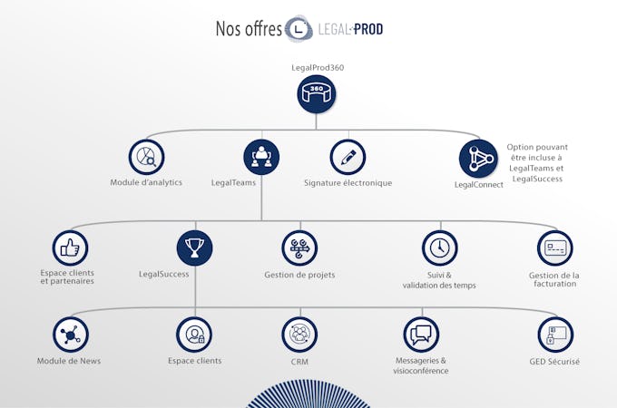 With LegalProd, optimize your business and boost your productivity. Discover our offers in detail: - LegalSuccess The reference in terms of business development. Easy to learn, you strengthen your ties with your clients and can easily manage your client relationship strategy, thanks to the integrated CRM developed especially for your legal activity. Thanks to integrated messaging and video conferencing, stay in constant contact with your customers. Streamline the sharing and saving of documents thanks to a virtual safe, accessible to your customer's thanks to the private customer portal, whose access you manage for maximum security.