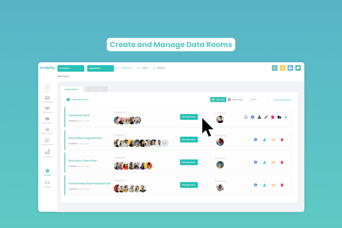 4. Advanced Data Room for Deal Management: Manage all deals and associated documents within a centralized and intuitive platform. Users can create new workspaces and invite clients, allowing for seamless collaboration and transparency. Effortlessly manage roles and permissions, ensuring that the right individuals have access to the right information.