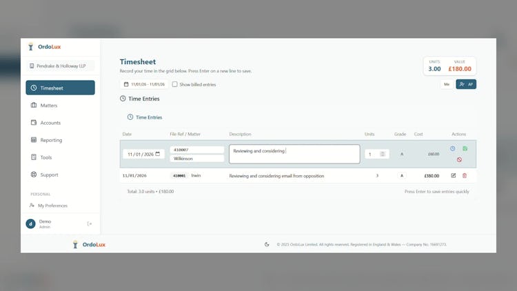 OrdoLux is cloud-based legal case management software designed specifically for UK law firms. Built by a practicing solicitor, it focuses on the workflows that actually cost firms money: time slippage, billing delays, and compliance friction. Outlook emails are automatically time-recorded as you send them. WhatsApp messages, voice notes and documents flow directly onto the matter file with automatic time suggestions built in.