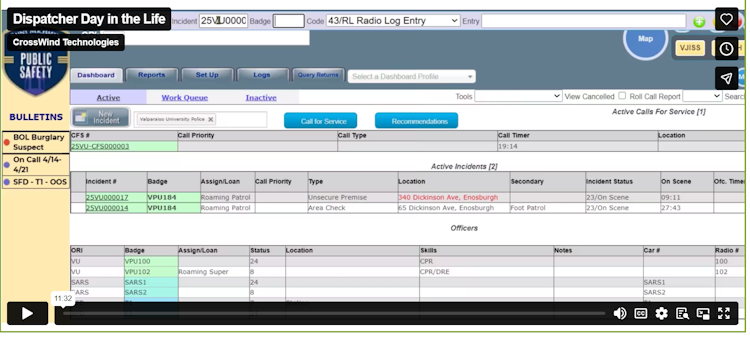 The computer aided dispatch module provides integrated dispatch functionality supporting flexible dispatch, self-dispatch, silent dispatch and shared dispatch operations. Dispatchers select either a text-based command line interface or a menu-driven interface based on preference with each call automatically assigned a sequential incident number according to agency configuration. Integrated mapping enables dispatchers to locate incidents geographically and identify the closest available units for response assignment.