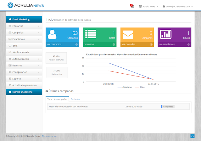 In addition, it incorporates the option of integration via API in each company's own software and an email address verification service to detect erroneous or inactive accounts. Data is collected in real-time and is accessible at all times. Free training tutorials are available on the site. If necessary, Acrelia's professional marketing service can be provided for advice and the design of promotional campaigns for customers.