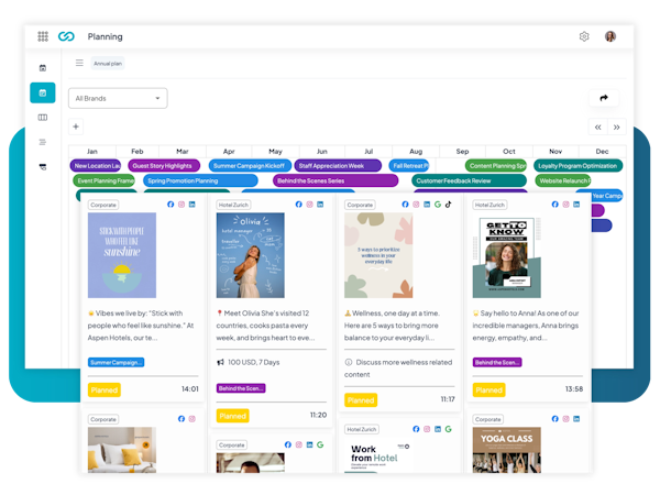 Cross-channel coordination, analysis and planning of social media posts. Supported platforms: Google My Business, Instagram, Facebook, Twitter, LinkedIn
