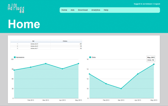 The AdPlugg dashboard gives users control over ad creation and modification, scheduling, grouping, placement, and targeting, and insight into ad performance. Users can schedule ads to run for set periods, with defined start and end dates, and create ad placements to manage their ad inventory by creating rule-based groups. Ad tags can be added to site source code to create ad zones, to which ads or ad placements can be targeted. Ads and placements can also be targeted to different pages of the site. Graphs and charts give users insight into ad performance, with tracking of impressions, clicks, and click-through rate. Users can also generate detailed reports for advertisers in PDF, XLSX or CSV formats.