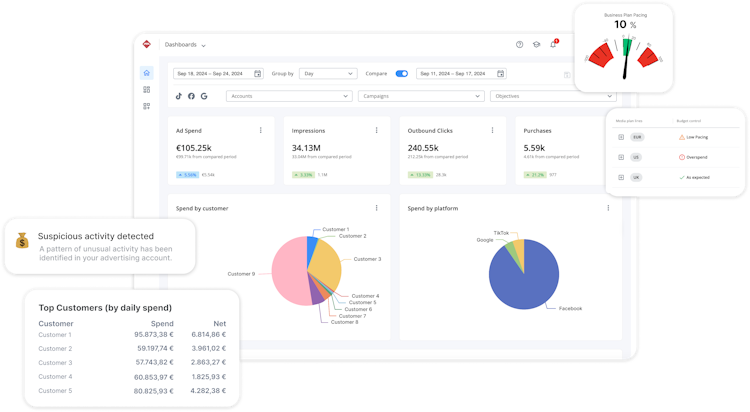 Agency Operations Hub helps centralize the management of clients, operations, and teams with Agency Operations Hub, automating processes, mitigating risks, and optimizing resources. This modular solution adapts to each agency's needs, improving operational efficiency through features like accurate campaign budget management, centralized team management, advanced protection for advertising accounts, and real-time visibility into business performance.