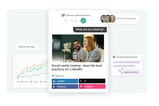 - Enable authentic personal posts with AI writing assistance, admin approval workflows, and platform-specific previews that keep content on-brand.