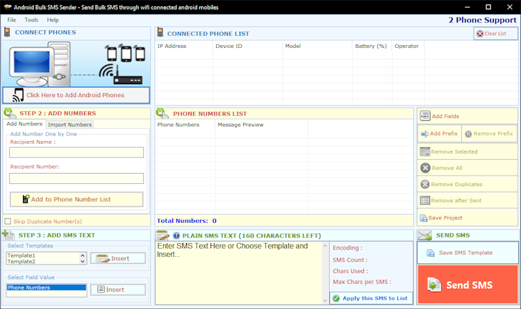 Android Bulk SMS Sender is a mass texting solution that enables users to transmit multiple SMS messages from various Android devices through a unified platform. The software connects Android phones to a computer, allowing for the dispatch of thousands of text messages collectively. Contact lists can be imported from computer files such as Excel or text formats or entered manually into the system. The software places no limitations on the number of recipients per message and supports international messaging by incorporating country codes as prefixes to mobile numbers.