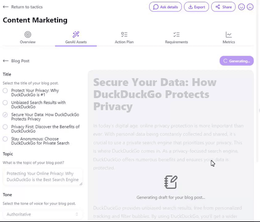 Craft and execute marketing plans 5x faster with AI-generated strategic tactics and action plans