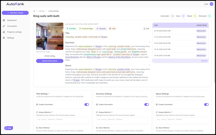AutoRank's automated listing optimization capabilities update Airbnb listings, incorporating the guest search behavior and popular keywords. It ensures listings remain updated, relevant, and aligned with current guest preferences.