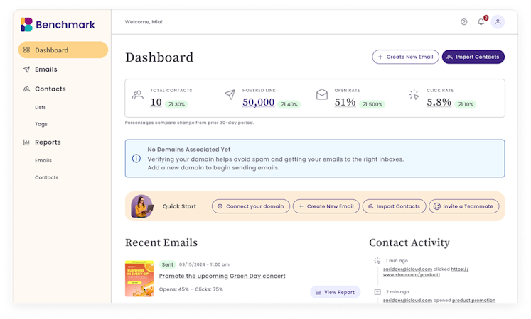 Benchmark Email is an email marketing platform that helps busy marketers design, send, and track professional email campaigns with ease. It’s built for marketing generalists at small to mid-sized businesses who need dependable tools that fit into their daily workflow — not software that slows them down. With Benchmark Email, users can quickly create polished, engaging campaigns, manage growing contact lists, and see performance results in real time — all from one simple, intuitive dashboard. Key features include: • Drag-and-Drop Email Builder: Design professional, mobile-responsive emails without coding or design experience. Choose from a curated library of templates and customize every detail using flexible content blocks. • Assistive AI Tools: Generate on-brand subject lines, body copy, and even image suggestions to speed up campaign creation and keep content fresh. • Contact Management: Use tags and segmentation tools to organize subscribers by interests, engagement, or behavior — making targeted campaigns easy to set up and manage. • Multi-User Access: Add teammates to your account and assign roles to keep campaigns organized while maintaining account-level control. • Email Scheduling: Plan and schedule campaigns in advance, ensuring your messages reach subscribers at the right time without manual effort. • Performance Dashboard and Reports: Track opens, clicks, and engagement trends in a clean visual format. Real-time data helps users identify what’s working and optimize future sends with confidence. • Real Human Support: Get help from real people, not bots. Our email marketing experts are available 24/7 via live chat and email to guide you through campaigns, troubleshoot issues, or share best practices when deadlines are tight. Benchmark Email focuses on what marketers actually need — reliable, straightforward tools that deliver results without unnecessary complexity. Every plan includes the same full feature set, so teams can focus on creating campaigns that connect and convert. Real-time reporting, flexible design tools, and responsive customer support make Benchmark Email a trusted choice for marketers who want to move fast, stay organized, and keep email marketing running smoothly — even on their busiest days.