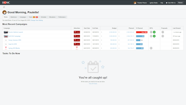 Built for media planners and media buyers, Bionic is the only fully-integrated, omnichannel media planning software + media buying software that delivers perfect media plans, beautiful flowcharts, online RFPs and IOs, flawless trafficking, delivery pacing, performance monitoring, automated reconciliations, client dashboards, and more!