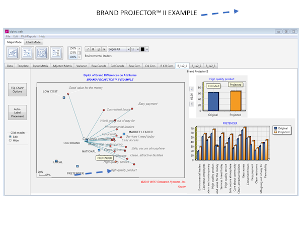 It offers Brand Projector I and II modules, which allow researchers to track attribute changes made between points by moving a brand or attribute higher or lower on the map. Administrators can visually compare data points on maps, automatically place intersections between brands and attribute vectors, and include supplementary or passive columns and rows in maps.