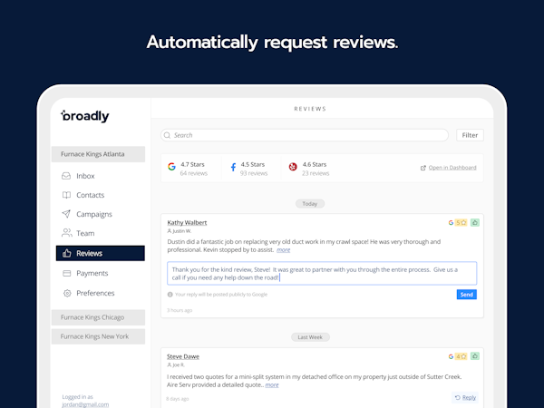 Broadly is an online review and reputation management tool that helps small service-providing businesses improve their online reputation, increase reviews, and attract new customers. The solution helps local businesses build their online presence, and enhance search ranking through SEO.Broadly's one-click technology enables customers to easily write feedback on Google, Facebook, and business websites, as well as other important review platforms. The online review tool helps automate customer feedback through a one-click review process which begins by asking customers about their experience via branded email or text, and then leading them directly to review sites. Real-time feedback allows businesses to get instant insight, allow them to follow up with customers about their experiences, and address any issues immediately and privately. SEO-optimized review streams enable users to add their online reviews directly to their business website using Broadly’s patent-pending code. All 4 and 5-star reviews from Google and Facebook are automatically published on the website, while updates to content help businesses appear at the top of local search results. Broadly also provides feedback at the employee level using team scorecards which allow users to track and better understand customer interactions by team member. Users can identify trends and reward great employee performance, as well as consolidate reviews and feedback alongside customer communication history. The multi-location dashboard allows franchises to monitor, manage, and respond to their online reviews across multiple locations from a single dashboard.