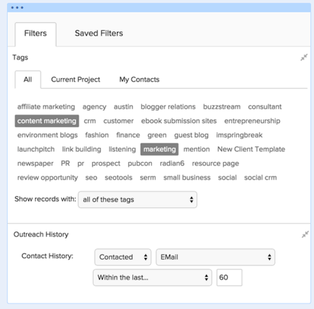 Filters: BuzzStream comes with advanced filters to navigate your contact database and pitch your project to the right influencer.