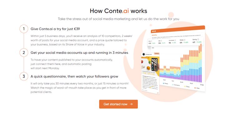 Conte.ai is the ideal combination of devoted specialists and AI-powered technologies that comprise a unique creative content development system that assures the generation of high-quality content. We will manage the copywriting, designing, and publishing once we have linked all of your corporate accounts into a cohesive ecosystem that communicates a message throughout all social media platforms.