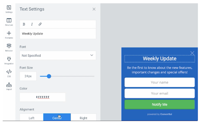 Convertful offers a range of responsive templates which users can design and customize how they like using the drag-and-drop editor. Users can add or edit texts, images, buttons, videos, form fields, page sharing controls, and more, customizing everything from style to layout, positioning and fields. Convertful enables users to create white-label widgets without any watermarks and copyrights. To ensure the offer appears to visitors at the right time, Convertful supports a number of triggers, including exit intent, inactivity time, time on page, page scroll and element click triggers. Advanced targeting tools ensure offers appear to the right people, enabling marketers to target people by visit source, page URL, time on site, and more.