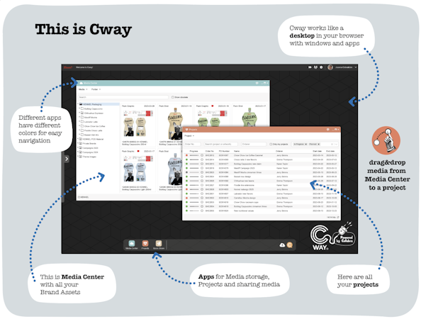 Cway mimics a desktop experience, with apps for every stage of artwork management, from organizing, storing, managing, reviewing to sharing artworks. Create or change media with simple drag & drop actions from the asset library or your desktop to the project tool. When finished, it’s transferred back to library. The easy and effortless process speeds up project initiation and eliminates the hassles of juggling files across platforms. It also makes searching for missing files a thing of the past.