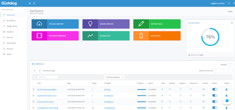 DCatalog is a digital publishing solution designed to help businesses in manufacturing, hospitality, marketing, universities, retail and financial institutions, and other industries manage PDF documents and publishing operations. The application allows users to convert marketing content, technical manuals, printed material, and more into a unique digital edition experience.