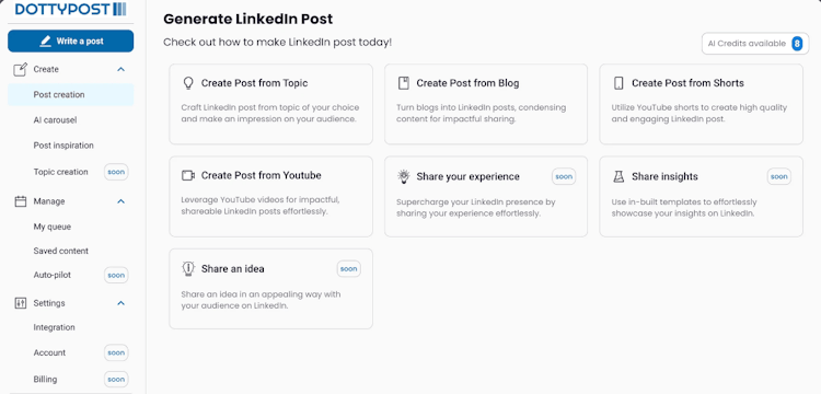Primarily, Dottypost facilitates the creation of engaging posts and dynamic carousels directly from various sources such as Shorts, YouTube, and Blogs. It offers features like post auto-pilot for scheduling and managing content effortlessly. Additionally, Dottypost provides access to a vast library of inspirational content and AI insights on existing viral posts.
