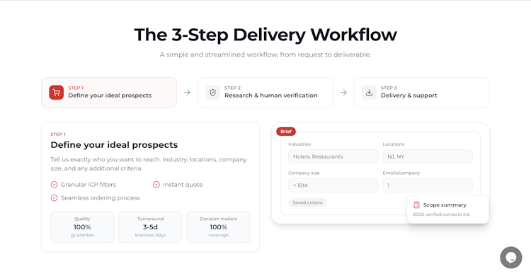 Contact data can be exported as CRM ready CSV files that support direct import into systems such as HubSpot and Zoho CRM. The standard delivery workflow follows three steps of customer profile definition, human verification and list delivery with a turnaround time of three to five business days. Data handling complies with CCPA and CPRA regulations and quality assurance measures are applied at each stage. A self service web portal offers instant quoting, saved search criteria and order management controls.