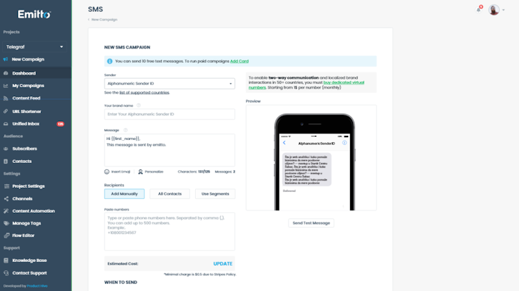 Emitto allows employees to distribute messages and broadcast notifications across multiple channels, including Viber, SMS, and browser-based push notifications. Marketing professionals can send SMS messages across the globe and generate campaign cost estimates. It lets supervisors create multiple team member profiles, import contacts, and manage subscriber lists from within a unified platform. It also enables employees to automatically send curated content and published RSS posts to customers.