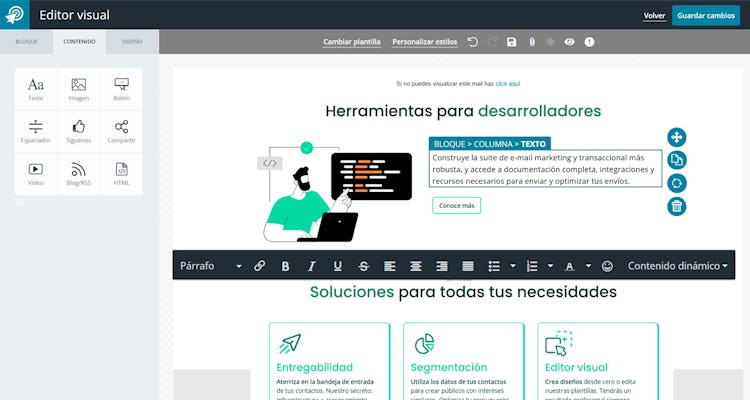 The platform includes a visual editor with drag-and-drop functionality for designing emails from scratch or modifying templates. Automation features allow users to configure campaigns that trigger at optimal times. EnvialoSimple offers segmentation capabilities to create targeted audiences based on contact data. The system is designed to ensure high deliverability rates, helping messages reach recipients' inboxes.
