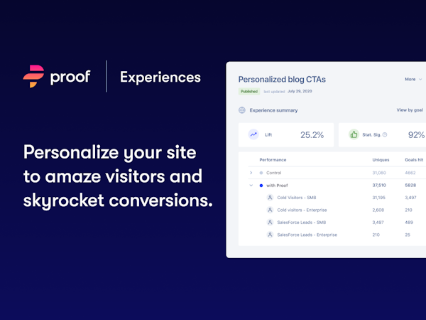 Proof Experiences is a website personalization solution, which provides features such as A/B testing, performance metrics, reporting and analytics, campaign personalization, lead nurturing, account-based marketing, engagement tracking, experience management, and behavioral targeting.
