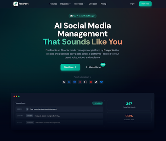 ForaPost is an AI powered social media management platform designed for comprehensive automation of content creation, scheduling, and publishing across eight major social media networks. The platform applies machine learning to analyze existing brand assets and stakeholder provided materials in formats such as pdf documents, audio files, video recordings, and web based content. This process establishes a detailed voice profile to guide authentic content generation. The software automatically formats and tailors posts according to each platform’s best practice requirements and optimizes publication timing for enhanced audience engagement.