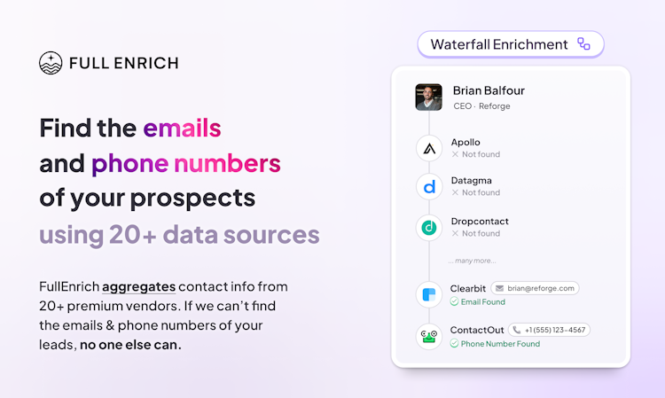 FullEnrich is a B2B email and phone waterfall enrichment platform. It aggregates contact information from 15 premium vendors to find the emails and phone numbers of leads. If FullEnrich cannot find a lead's contact info, no one else can.