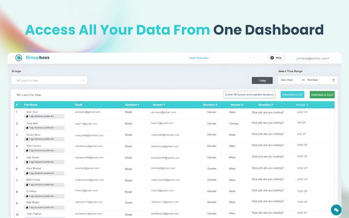 The platform operates through a browser extension that links directly with Facebook group membership question features and extracts responses as new members join. Administrators configure up to three membership questions and review captured information in a centralized repository. Export options include comma separated value file formats or direct synchronization with Google Sheets for ongoing data management. A user friendly dashboard enables viewing of historical member information, tracking of incoming responses and centralized management of multiple Facebook groups. Functionality for creation of custom and lookalike audiences in Facebook advertising leverages names and email addresses captured from group members.