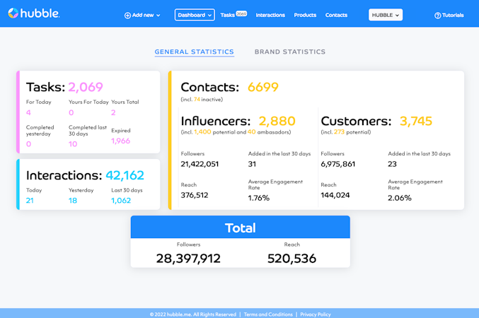 Hubble is an influencer marketing software that helps businesses find, manage, and pay influencers across social networking platforms. The system enables teams to schedule posts, track campaigns, and measure ROIs on a unified interface.