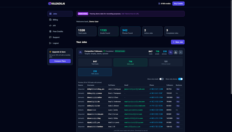 IGLeads.ai is an AI powered platform designed to assist sales teams, marketing agencies, cold outreach specialists and growth professionals in extracting contact details from Instagram profiles in real time. It operates as a live scraping tool and retrieves email addresses, phone numbers and business details from follower lists, hashtag participants, location based accounts and competitor audiences. It does not require Instagram login credentials. It differs from database based services by performing real time profile visits at the time of each request to ensure that collected information reflects the most current public data.