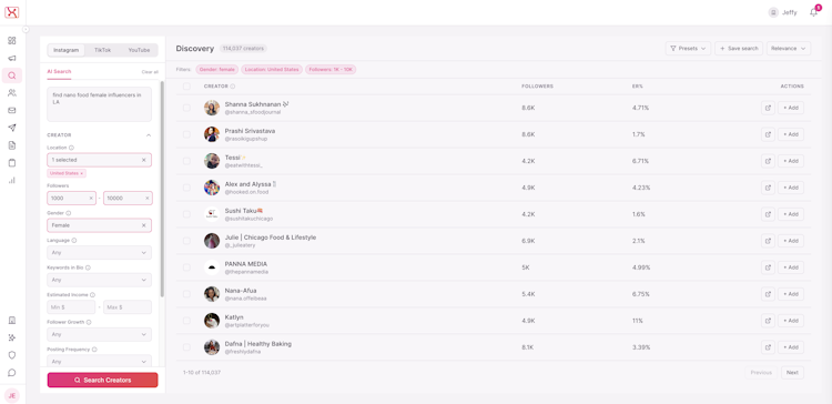 The platform includes an AI powered creator discovery engine that provides access to over three hundred forty million indexed creator profiles searchable through natural language queries or fifty configurable filters. Discovery delivers verified email addresses audience demographic information engagement metrics and forty data points per creator profile with single click enrichment capabilities. A unified creator inbox aggregates conversations from WhatsApp Instagram direct messages and email into single threaded views per creator thus eliminating the need to switch between applications during follow-up communications. A customizable Kanban style pipeline board enables tracking of creators through configurable campaign stages from initial contact to active campaign status providing visibility into deal progression and identification of stalled negotiations.