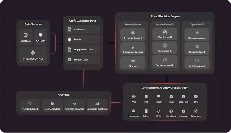 With AI at its core and an integrated Customer Data Platform (CDP), Insider One unites data, personalization, and journey orchestration across the most extensive set of natively supported channels, including WhatsApp, SMS, Email, Web, App, and Site Search.